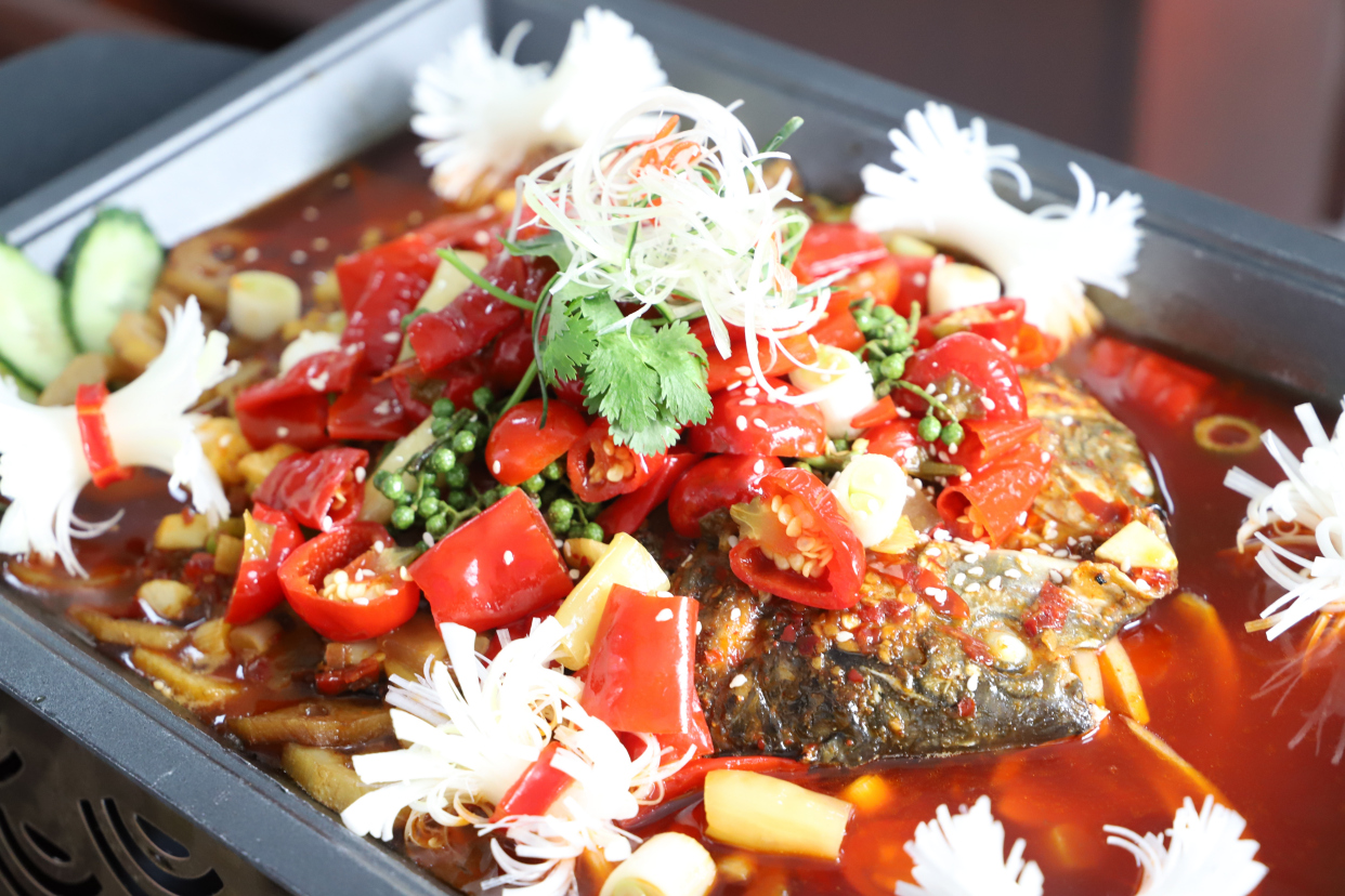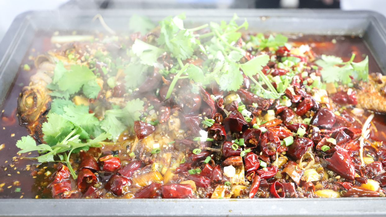 一道传统的万州烤鱼,是麻、辣、鲜、香的完美糅合,需辣椒充分迸发出来。猛火,热油,辣椒和配料依次爆香,既除掉了鱼的腥味,又完全激发了鱼的鲜美。