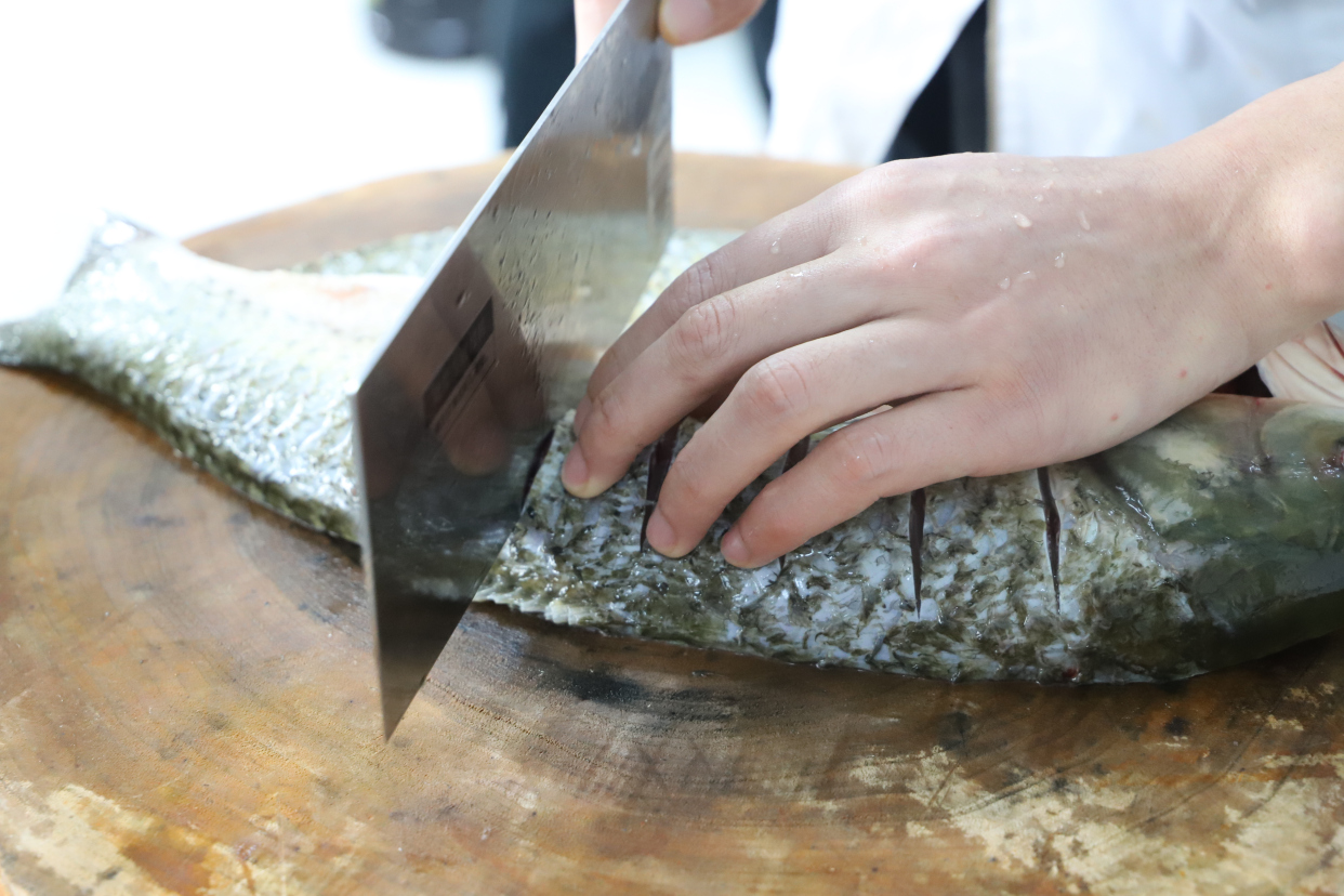 第一步【选】 细赏鲜活,眼腮鳍鳞。采购鲜鱼时,仔细观察鱼眼、鱼腮、鱼鳍、鱼鳞,确保它足够鲜活。 第二步【杀】 敲头开背,去沫除腥。先从头部敲晕鱼,再从鱼背的大骨部分进行解剖,处理干净鱼身上的黑色黏膜和鱼肚里的黑膜,这一步也是为了去除鱼的腥味。 第三步【腌】 浸盐渍汁,辛香调和。腌料的调配和腌制的时间都非常重要。 第四步【烤】